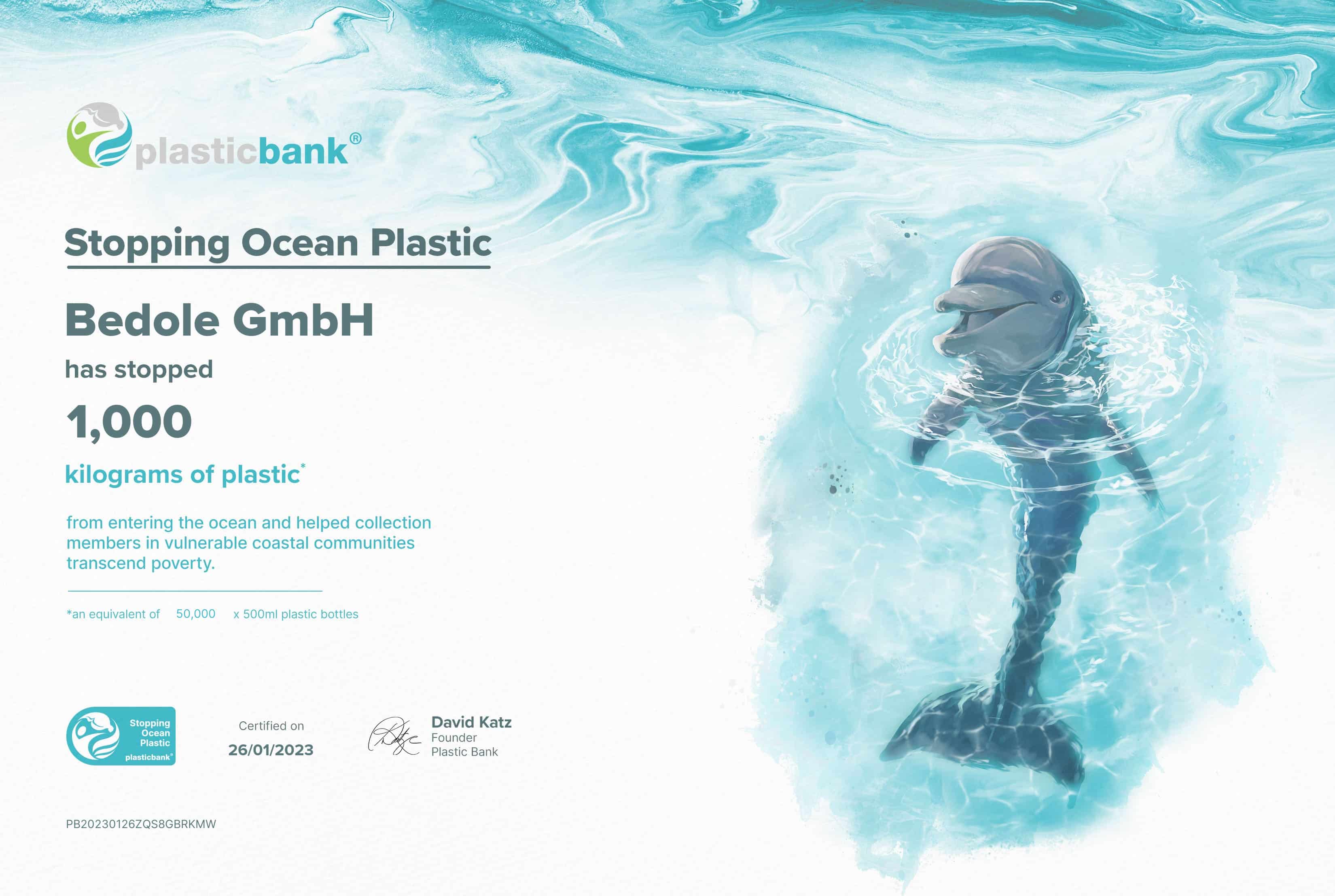 Pro Bestellung sorgt unser Partner Plasticbank dafür, dass ein Kilogramm Plastik (das entspricht ca. 50 Plastikflaschen á 500ml) nicht ins Meer gelangt. Jede Bestellung in unserem Online Shop trägt ein Stück dazu bei, unsere Weltmeere von Plastikmüll zu befreien!
